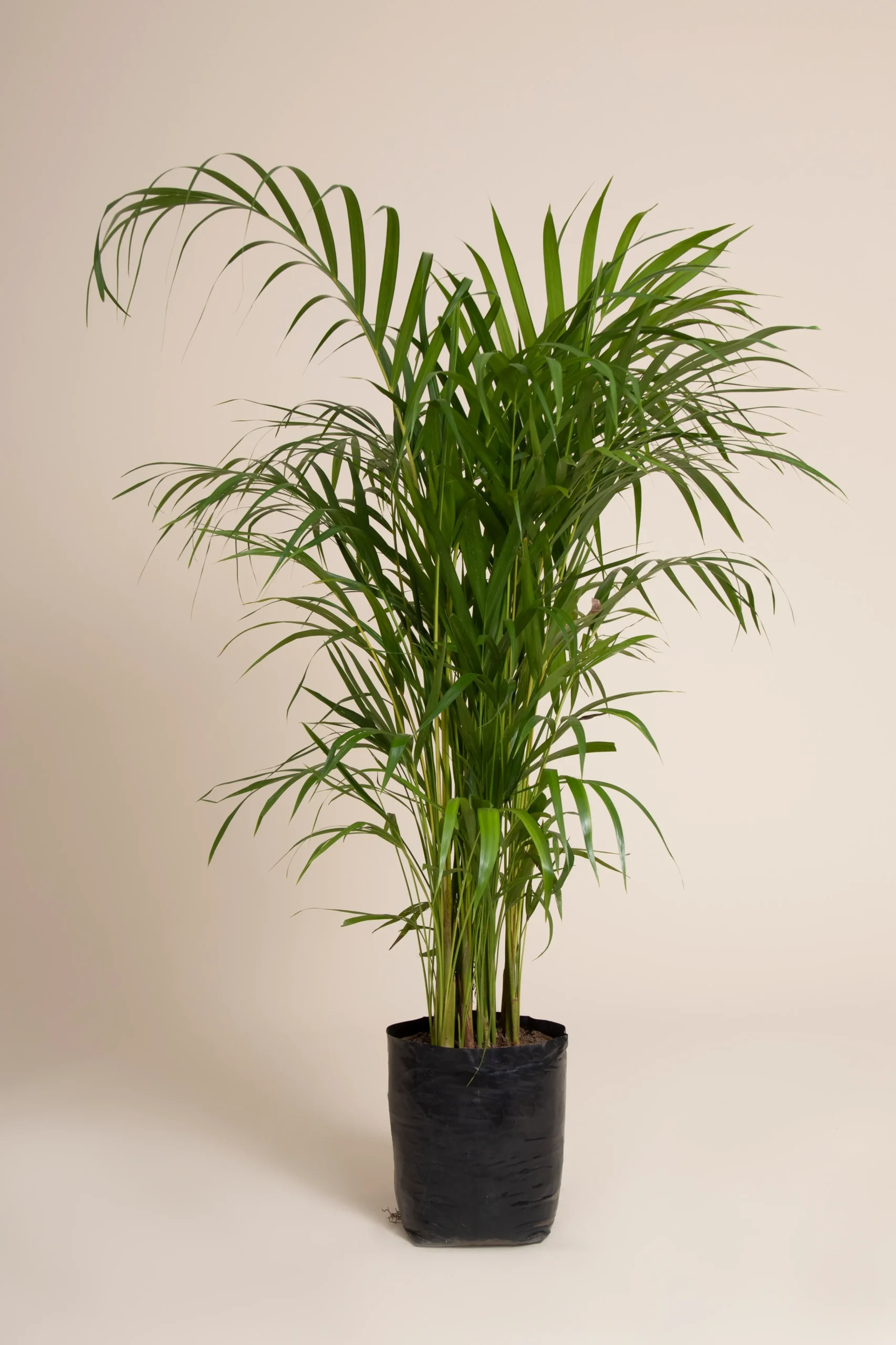 La palma areca necesita luz indirecta brillante, riego moderado permitiendo que la capa superior del sustrato se seque entre riegos, suelo bien drenado y temperaturas cálidas (18-25 °C). Fertiliza mensualmente en primavera-verano, limpia las hojas regularmente, y evita corrientes frías y exceso de agua. Altura aproximada 1,50 m.