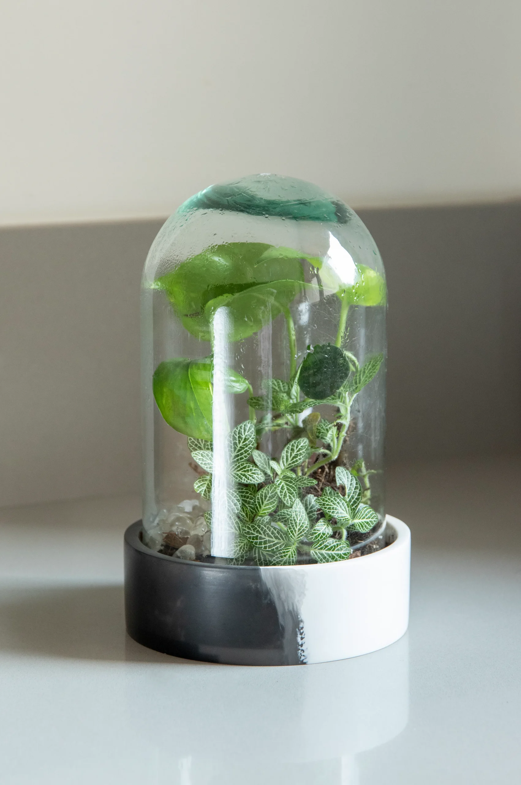 Terrario con forma de cúpula con plato de resina blanco y negro (Izta). Mix de plantas de interior; teléfono, fittonia